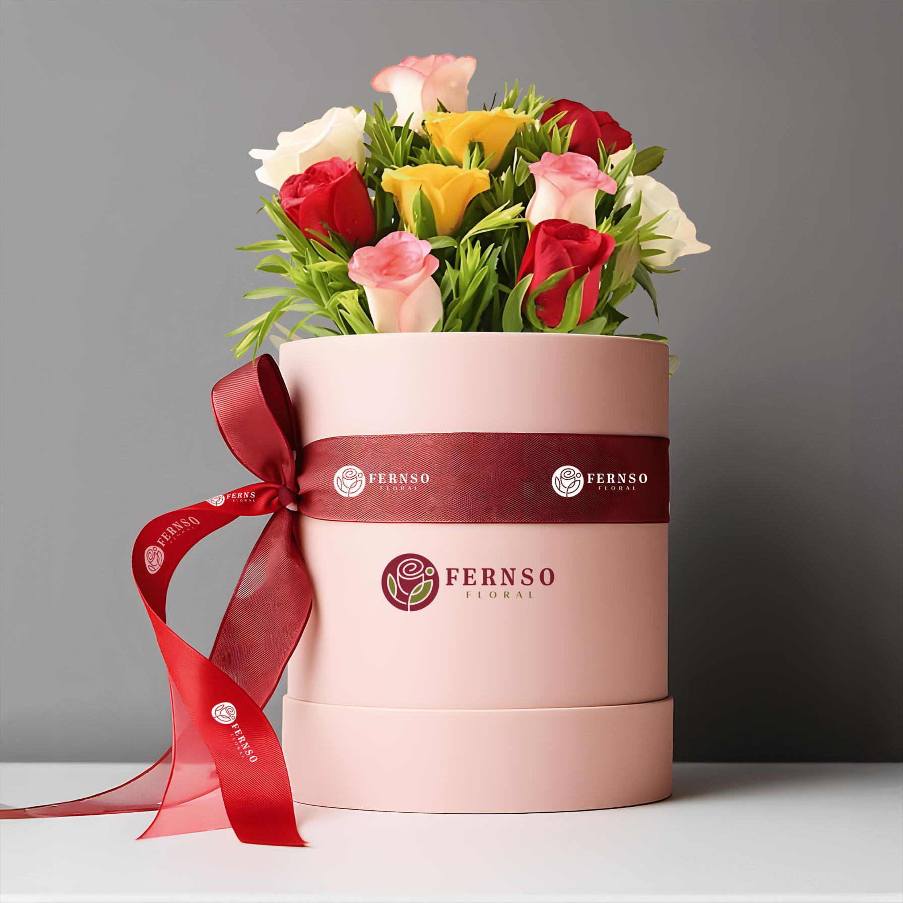 Surprise your loved ones with a stylish gift – a set of 10 premium roses in shades of red, yellow, and peach, beautifully presented in an elegant Fernso box.