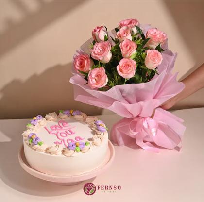 10 pink roses with half kg chocolate cake. Perfect floral and sweet combo for birthdays.