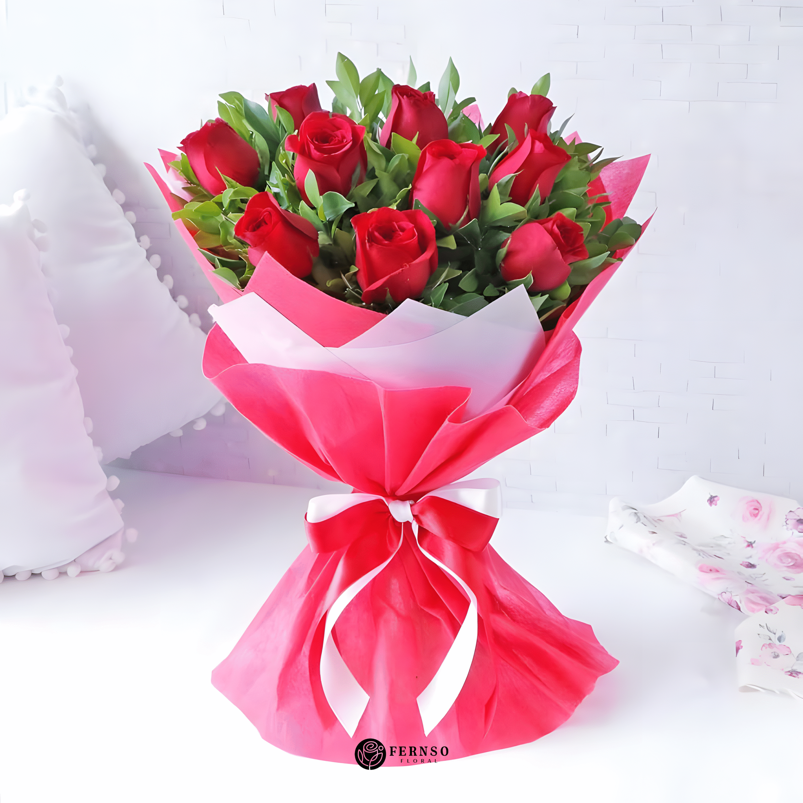 A bouquet of 10 radiant red roses, each bloom carefully selected for its rich color and velvety petals, comes together to create a timeless expression of love and passion. Symbolizing deep affection, admiration, and devotion, this arrangement is more than just flowers—it is a message from the heart. The roses are beautifully complemented with fresh green foliage, enhancing their natural elegance and charm. Perfect for anniversaries, proposals, birthdays, or simply to remind someone how special they are, this bouquet of 10 red roses is a classic gesture that speaks the universal language of romance and makes every moment unforgettable.