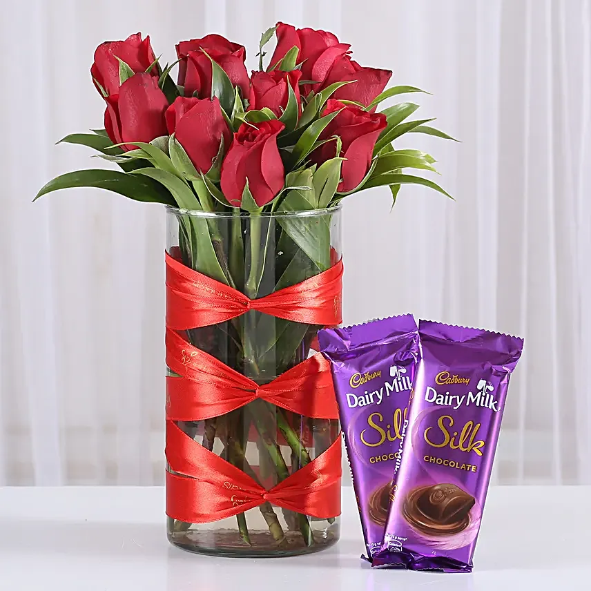 10 Red Roses in a Glass Jar with 2 Silk Chocolate