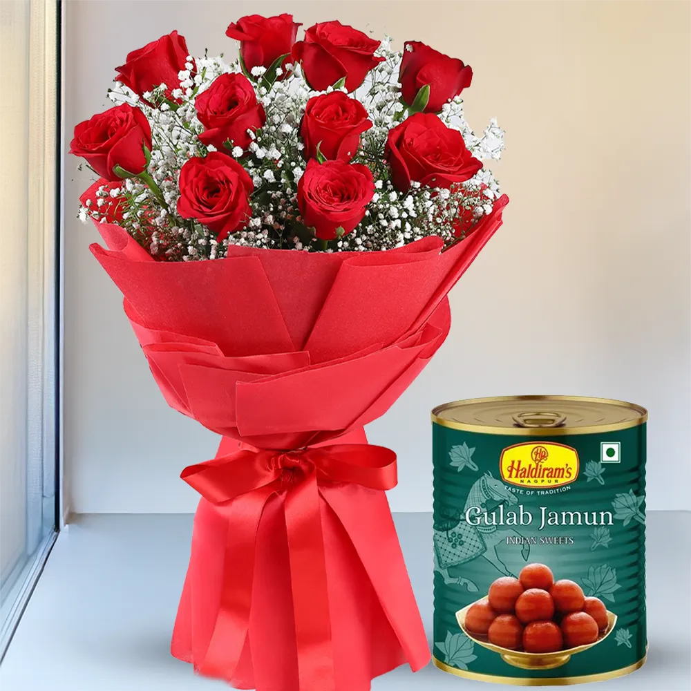 Express love and sweetness with this perfect combo of 10 elegant red roses paired with a box of delicious 500g Haldiram Gulab Jamun.