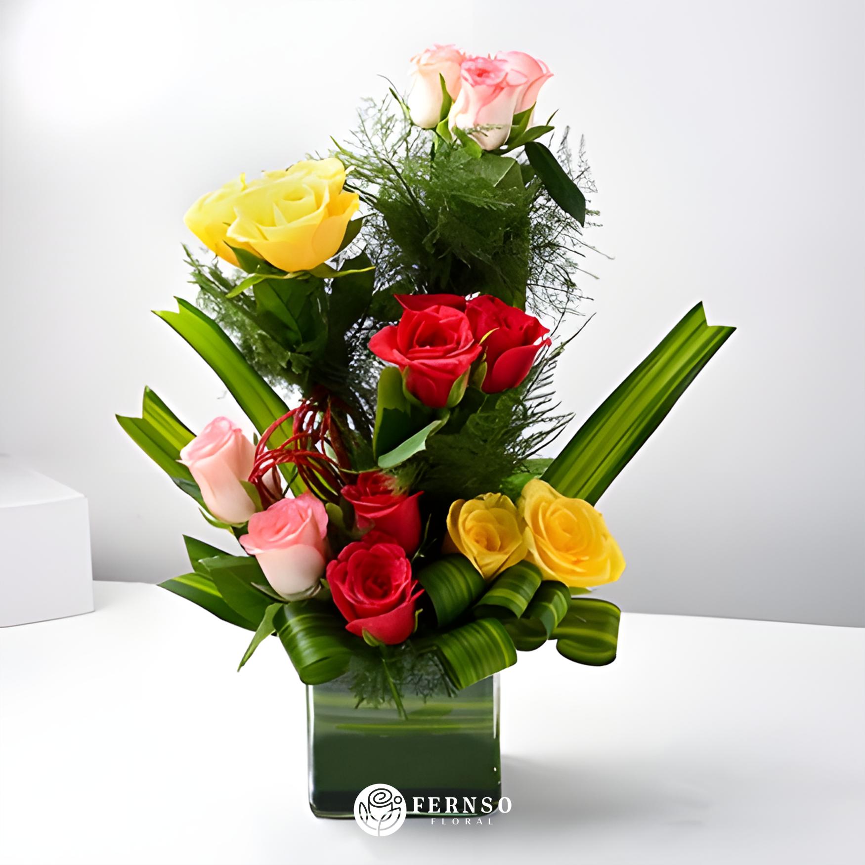A vibrant and joyful arrangement of yellow, pink, and red roses, beautifully displayed in a clear glass jar. This cheerful bouquet is designed to spread happiness and warmth wherever it’s placed.