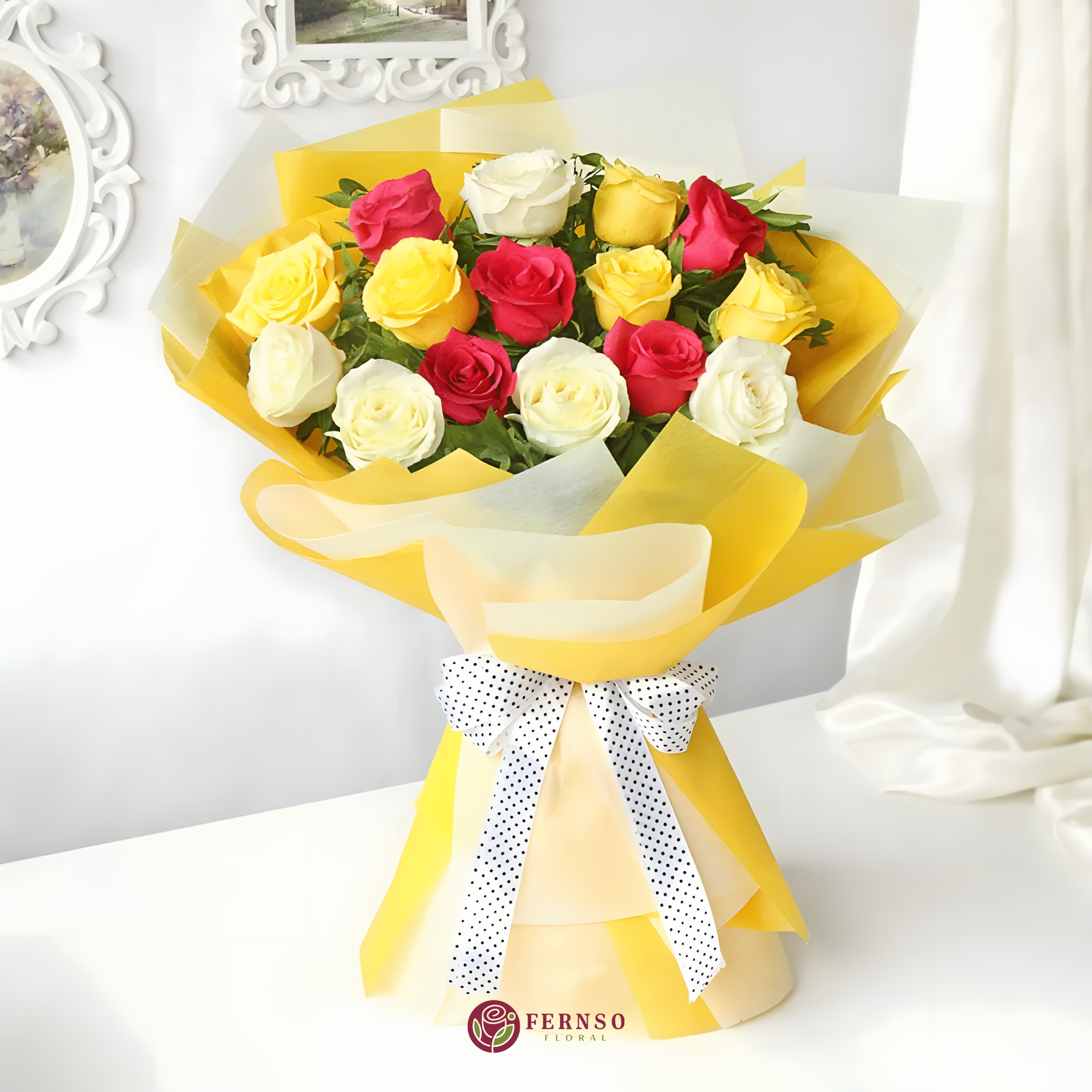 Express a blend of emotions with this stunning bouquet of 15 fresh roses in vibrant shades of yellow, red, and white. Each color carries a heartfelt meaning – red roses symbolize love and deep passion, yellow roses stand for friendship, joy, and warmth, while white roses reflect purity, peace, and new beginnings.
