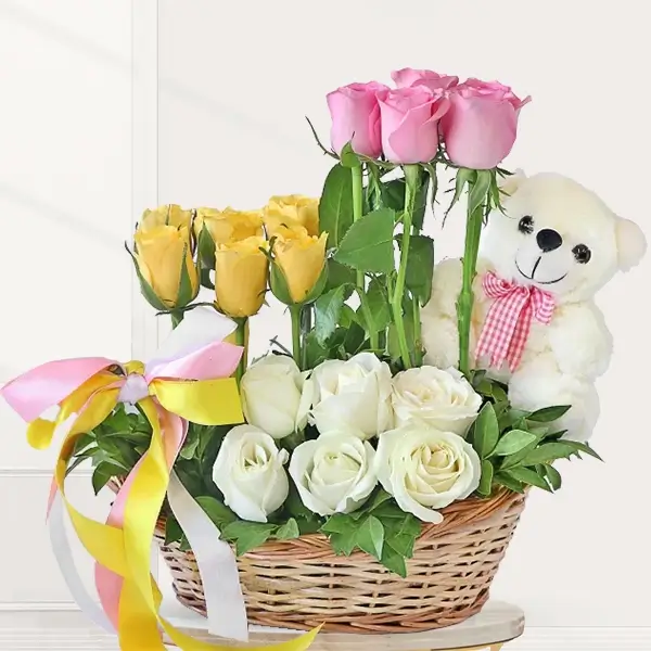 16 Mixed Roses – A vibrant assortment of   yellow, pink, and white roses beautifully arranged in a decorative basket, symbolizing love, joy, friendship, and purity. Each bloom is hand-picked for freshness and arranged to create a burst of color and fragrance.