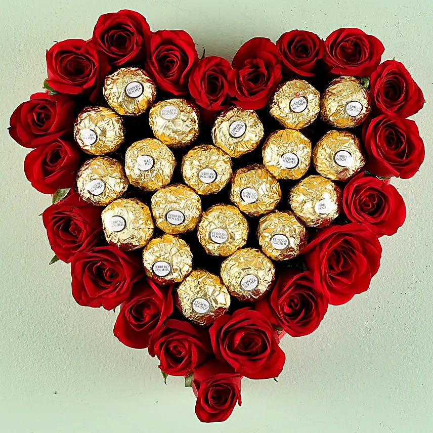24 Ferrero Rocher Chocolates – Nestled beside the roses in a beautiful heart-shaped box, these premium hazelnut chocolates add a touch of golden elegance and irresistible sweetness to your gesture.