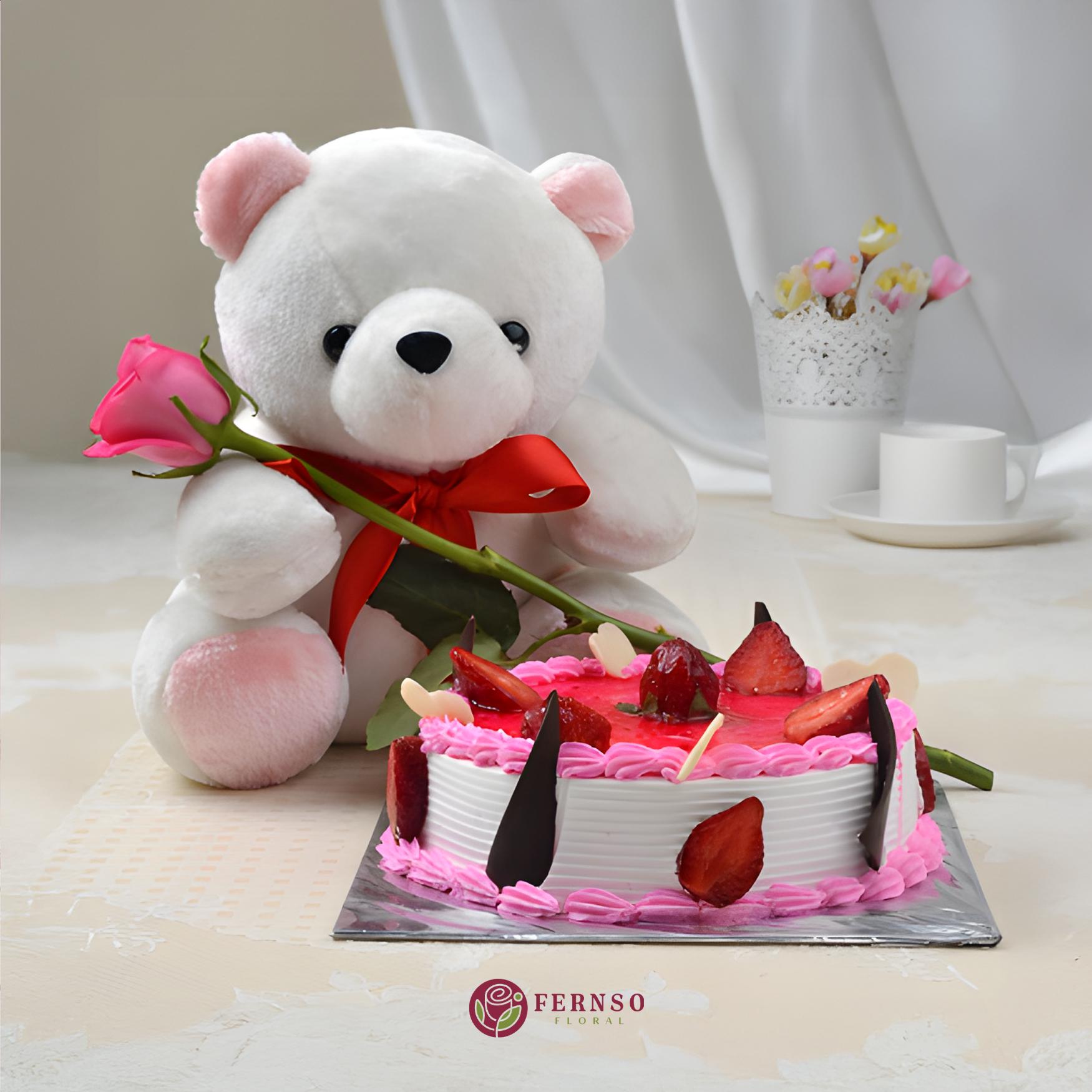 Combo of Single Pink Rose, Cute 35cm Teddy & Delicious Cake