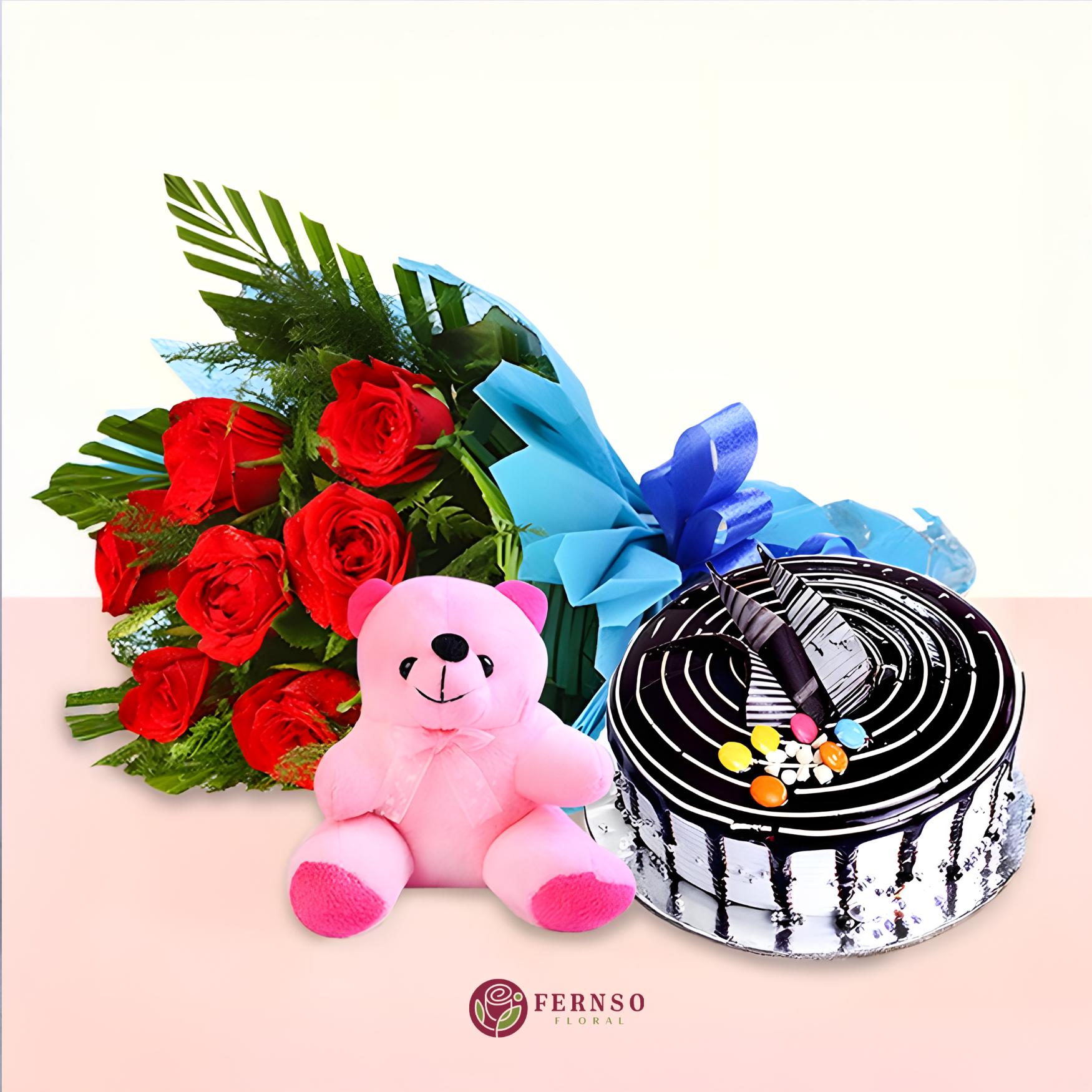 Surprise your loved one with this romantic and indulgent treat — a perfect blend of love, sweetness, and warmth. Featuring a bouquet of 6 fresh red roses (the ultimate symbol of love), a soft and cuddly teddy bear, and a half kg rich chocolate cake, this combo is designed to make special moments unforgettable.