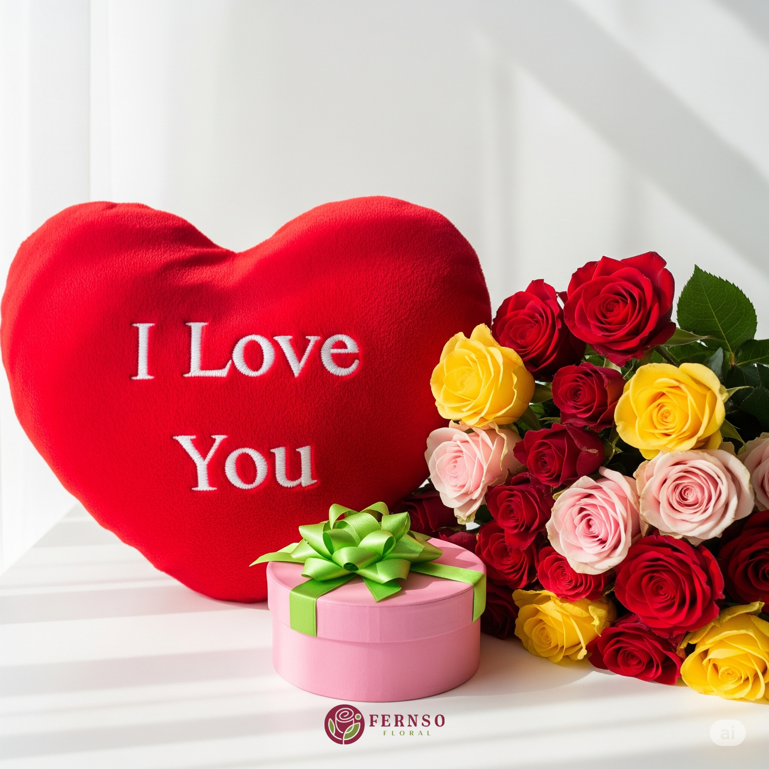 Product Name: Love Expression Combo A heart-touching gift set that beautifully conveys your deepest emotions. This Love Expression Combo features a soft red heart-shaped cushion embroidered with “I Love You”, a vibrant bouquet of mixed roses in red, yellow, and pink symbolizing passion, friendship, and admiration, along with a charming pink gift box tied with a green ribbon.