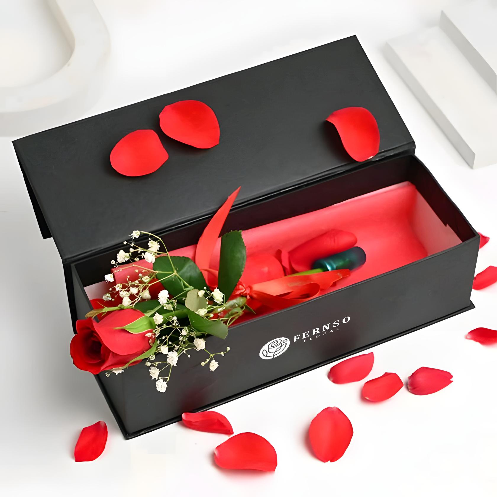 A symbol of pure love and timeless romance, this single premium red rose is beautifully presented in a sleek Fernso black box. The striking contrast of the velvety red bloom against the elegant black box makes this gift modern, stylish, and unforgettable.